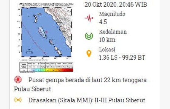 "Gempa Mag:4.5, 20-Okt-20 20:46:57 WIB, Lok:1.36 LS, 99.29 BT (Pusat gempa berada di laut 22 km tenggara Pulau Siberut), Kedlmn:10 Km Dirasakan (MMI) II-III Pulau Siberut #BMKG," tulis @infoBMKG, akun twitter resmi BMKG, Selasa (20/9/2020) malam.