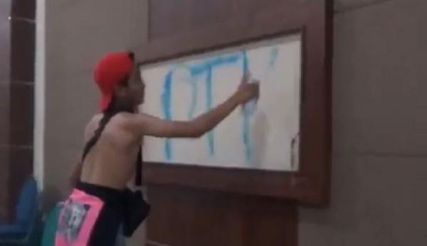 Sebagian mahasiswa juga terlihat melakukan aksi vandalisme. Mereka mencoret-coret dinding dan papan whiteboard dengan kata-kata makian.