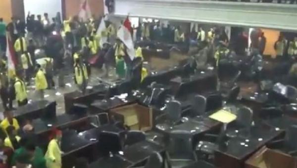 Mahasiswa peserta demonstrasi melakukan perusakan terhadap fasilitas di ruang sidang paripurna Gedung DPRD Sumbar Rabu (25/9/2019). (Foto: iNews.id/Budi Sunandar)